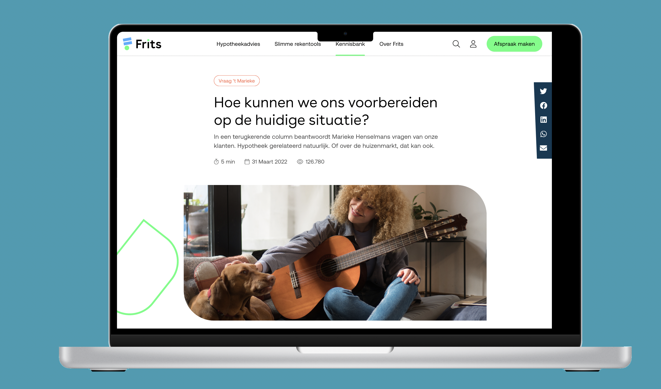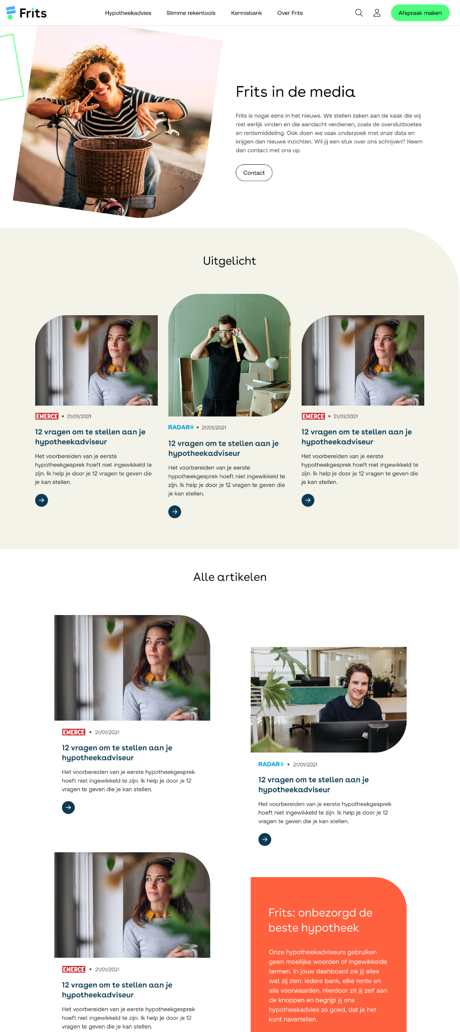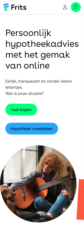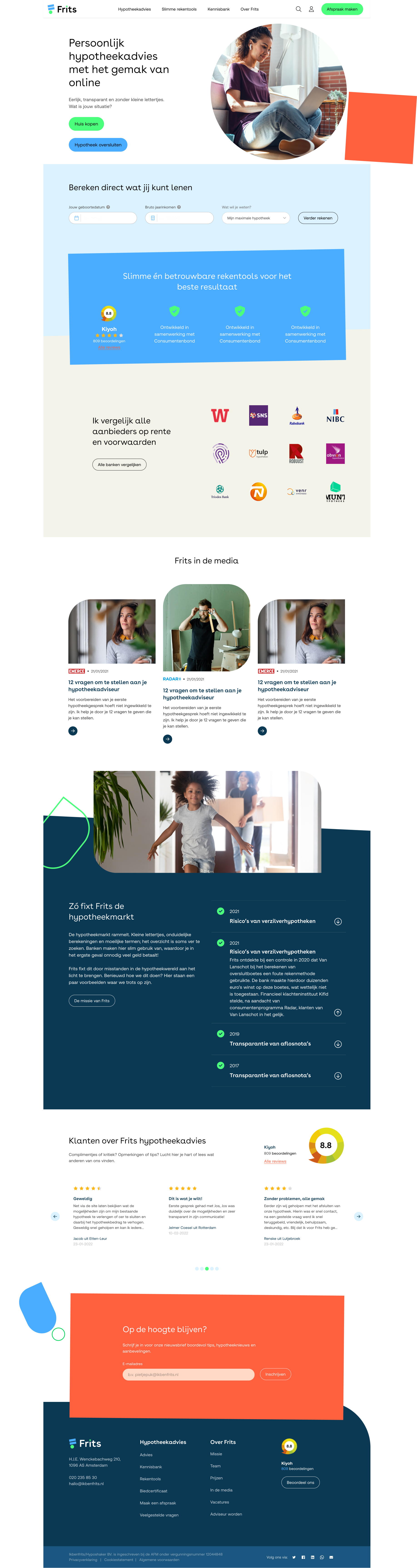 Because Frits is an online business, with no locations and face-to-face mortgage appointments, it completely depends on the website and tooling for connecting to its customers. Therefore, Frits has invested in a completely new visual identity. The visual identity was created by Denstsu Creative Amsterdam and translated to a webdesign by me.