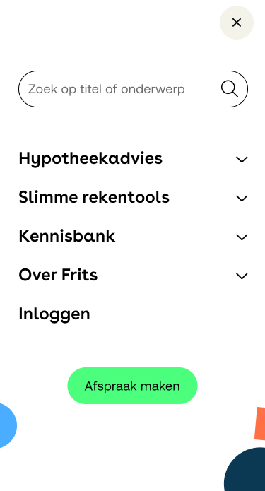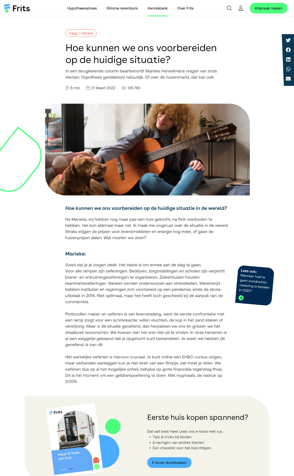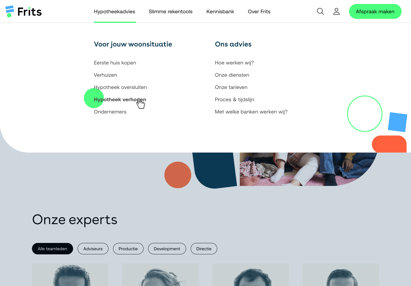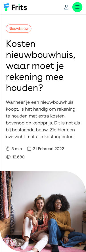 Because Frits is an online business, with no locations and face-to-face mortgage appointments, it completely depends on the website and tooling for connecting to its customers. Therefore, Frits has invested in a completely new visual identity. The visual identity was created by Denstsu Creative Amsterdam and translated to a webdesign by me.